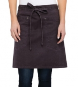 The Dorset Half Waist Apron features ties with grommets and two hip pockets with riveted ends. Pocket holds iPad2 or similar device. Available in earth brown and pewter.