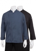 The Hartford Zipper Chef Jacket features cool vent sides. Single-breasted design features a two-way zipper, roll-up long sleeves, a back collar apron holder, left sleeve thermometer pocket and right sleeve cell phone/notebook pocket. Available in black and slate blue.